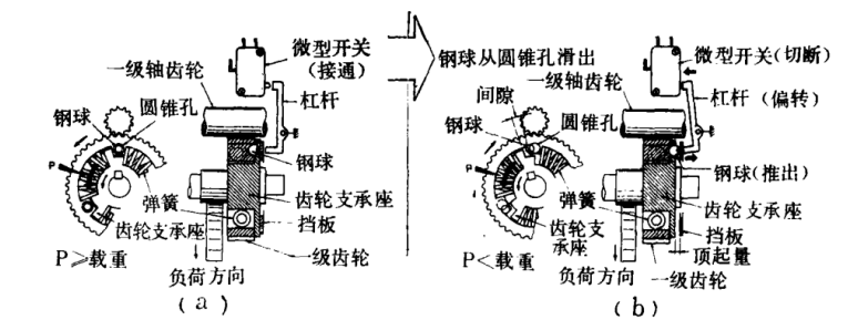 圖b為超負(fù)荷狀態(tài),符合扭矩超過彈簧力時,二級軸齒輪和一級軸齒軸分離,鋼球從圓錐孔推出,擋板被頂出。擋板推動杠桿偏轉(zhuǎn)時,操作回路的微型開關(guān)切斷,停止運(yùn)轉(zhuǎn)。