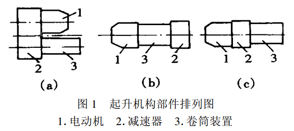 電動葫蘆的起升機構(gòu)主要有:起升用錐形轉(zhuǎn)子制動電機、卷筒裝置、減速器和吊鉤裝置4個動力和傳動部件。電機、減速器和卷筒裝置3個部件的排列有平行軸(a)和同軸兩種排列方式,同軸式有分有(b)和(c)兩種排列,見圖1。
