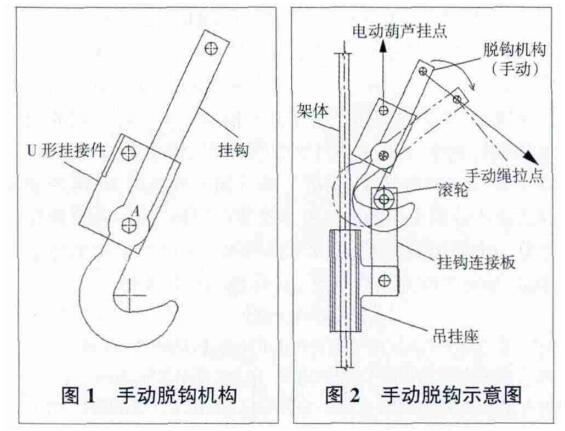 手動脫鉤工作原理。如圖2所示,掛鉤通過滾輪把架體鉤住,電動葫蘆通過U形連接件連接,把架體吊掛在附著處,當(dāng)掛鉤被人用繩索拉動并繞A點(diǎn)轉(zhuǎn)動時,掛鉤下部圓弧逐步速脫開滾輪,脫開后架體失去支承而墜落。