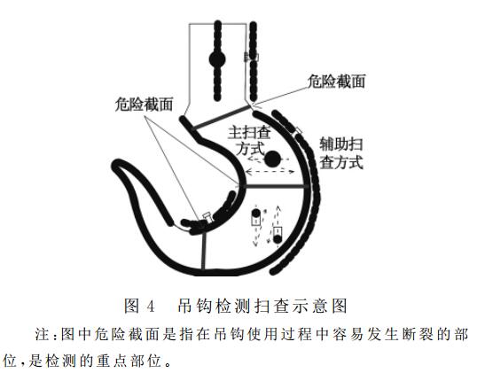 為防止缺陷漏檢,按圖4進行掃查直探頭采用接觸式在鉤柄圓柱、鉤腔、鉤腔外圓弧和鉤頭一側表面垂直于鍛造流線方向做鋸齒形掃查。掃描線按聲程1:1調(diào)節(jié),以2平底孔為掃 查靈敏度,3平底孔為評定線靈敏度,耦合補償用試塊和工件實際測定。斜探頭在鉤頭兩側面沿鍛造流線方向做平行掃查和斜探頭在鉤腔內(nèi)表面垂直于鍛造易折疊部位做鋸齒型掃查,掃描線速度按聲程1:1調(diào)節(jié),靈敏度按2.4.3調(diào)節(jié),耦合補償用試塊和工件實際測定。確因鍛件幾何形狀的限制而掃查不到的部位,應予以記錄和圖示,必要時還應得到各方同意。