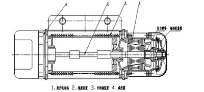 CD1型電動(dòng)葫蘆起升機(jī)構(gòu)采用錐形轉(zhuǎn)子電動(dòng)機(jī),它具有產(chǎn)生軸向磁拉力的特點(diǎn)。起動(dòng)時(shí),磁拉力克服彈簧壓力使轉(zhuǎn)子和與定子連成一體的風(fēng)扇制動(dòng)輪產(chǎn)生軸向位移,制動(dòng)輪剎車環(huán)與后端差脫開,轉(zhuǎn)子即在工作狀態(tài)下自由運(yùn)轉(zhuǎn),它通過(guò)中間軸裝置直接帶動(dòng)減速器的輸入軸轉(zhuǎn)動(dòng),經(jīng)過(guò)三級(jí)齒輪減速,由減速器的輸郵軸——空心軸驅(qū)動(dòng)卷筒轉(zhuǎn)動(dòng),纏繞鋼絲繩,使吊鉤升降。當(dāng)斷電后,磁拉力消失,在壓力彈簧的作用下,風(fēng)扇制動(dòng)輪與后端差剎緊,依靠剎車的磨擦力在瞬間獲得制動(dòng)作用,電動(dòng)葫蘆起升機(jī)構(gòu)不工作。