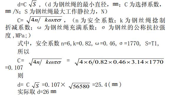 所以,與撬塊設(shè)備相匹配的是直徑為 26 ㎜,規(guī)格為6×7+IWR,強(qiáng)度級(jí)別為 1770Mpa 的鋼絲繩。