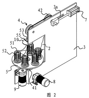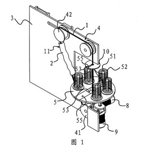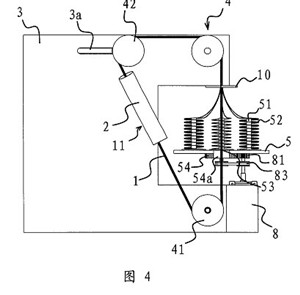 一種環(huán)形穿絲吊裝帶的生產(chǎn)裝置,它包括一塊固定板(3),在固定板(3)上設(shè)有用于撐開環(huán)形穿絲吊裝帶(11)的滾輪組(4),滾輪(41)驅(qū)動(dòng)裝置與其中至少一個(gè)滾輪(41)相聯(lián)并可通過該滾輪(41)帶動(dòng)環(huán)形絲吊裝帶(11)轉(zhuǎn)動(dòng),其特征在于,所述的固定板(3)的側(cè)部設(shè)有一個(gè)轉(zhuǎn)盤(5),在轉(zhuǎn)盤(5)上設(shè)有若干個(gè)用于放置線團(tuán)(52)的線架(51),轉(zhuǎn)盤(5)具有一個(gè)供撐開在滾輪組(4)上的環(huán)形穿絲吊裝帶(11)進(jìn)入并垂直穿過轉(zhuǎn)盤(5)中心的缺口(53),上述轉(zhuǎn)盤(5)與一個(gè)當(dāng)撐開在滾輪(41)組(4)上的環(huán)形穿絲吊裝帶(11)轉(zhuǎn)動(dòng)時(shí)可帶動(dòng)轉(zhuǎn)盤(5)上的各個(gè)線架(51)繞環(huán)形穿絲吊裝帶(11)轉(zhuǎn)動(dòng)的轉(zhuǎn)盤(5)驅(qū)動(dòng)裝置相聯(lián)接,所述的轉(zhuǎn)盤(5)驅(qū)動(dòng)裝置包括一個(gè)與電機(jī)一(8)相聯(lián)的主驅(qū)動(dòng)齒輪(81),在轉(zhuǎn)盤(5)的底部中心設(shè)有一個(gè)與主驅(qū)動(dòng)齒輪(81)相嚙合的轉(zhuǎn)動(dòng)齒輪(54),轉(zhuǎn)動(dòng)齒輪(54)具有與轉(zhuǎn)盤(5)上的缺口(53)上下對(duì)應(yīng)的開(54a),在轉(zhuǎn)動(dòng)齒輪(54)旁還設(shè)有一個(gè)副驅(qū)動(dòng)齒輪(82),所述的副驅(qū)動(dòng)齒輪(82)通過同步傳動(dòng)帶(83)與主驅(qū)動(dòng)齒輪(81)相連。