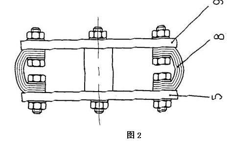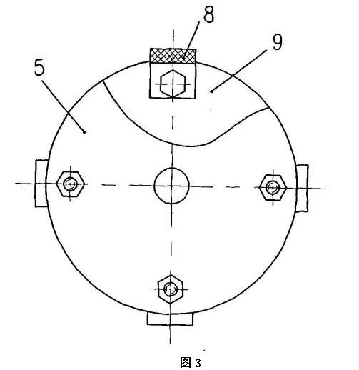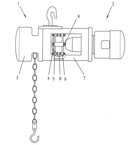 該電動(dòng)葫蘆采用獨(dú)特的設(shè)計(jì),利用手拉葫蘆和煤電鉆相結(jié)合,其手拉葫蘆的手拉轉(zhuǎn)輪上沒有纏繞搭接手拉鏈,煤電鉆包括機(jī)殼和卡裝在煤 電鉆的卡具上的鉆桿,手拉轉(zhuǎn)輪與鉆桿同軸設(shè)置,手拉轉(zhuǎn)輪朝外的端面朝向煤電鉆,殼體和機(jī)殼采用固定架固定相連,手拉轉(zhuǎn)輪朝外的端面上固定有手拉轉(zhuǎn)輪法蘭盤,手拉轉(zhuǎn)輪法蘭盤上均布有多個(gè)螺栓孔,每個(gè)螺栓孔處采用緊固件分別與一個(gè)皮帶條的一端固定相連,每個(gè)皮帶條的另一端通過(guò)鉆桿法蘭盤上的螺栓孔采用緊固件連接固定在鉆桿法蘭盤上,鉆桿法蘭盤上的螺栓孔位置與手拉轉(zhuǎn)輪法蘭盤上的螺栓孔位置對(duì)應(yīng),鉆桿法蘭盤安裝固定在鉆桿的端頭上。在使用時(shí),當(dāng)需要起吊重物時(shí),可利用煤電鉆的電機(jī)帶動(dòng)鉆桿按照需要的方向旋轉(zhuǎn),鉆桿就會(huì)通過(guò)鉆桿法蘭盤、多個(gè)皮帶條8和手拉轉(zhuǎn)輪法蘭盤帶動(dòng)手拉葫蘆的手拉轉(zhuǎn)輪按照需要的方向轉(zhuǎn)動(dòng),從而完成對(duì)重物的起吊。由于采用皮帶條這種軟連接設(shè)計(jì)將煤電鉆的電機(jī)產(chǎn)生的扭矩傳遞到手拉葫蘆的手拉轉(zhuǎn)輪,保證了手拉葫蘆轉(zhuǎn)動(dòng)的平穩(wěn)性,再由于煤電鉆的輸出轉(zhuǎn)速較低,不需要另加減速裝置,故本發(fā)明的利用手拉葫蘆和煤電鉆改造成的電動(dòng)葫蘆的結(jié)構(gòu)非常緊湊,體積也較小,尤其適宜井下機(jī)電硐室起吊、裝卸設(shè)備和物件、以及安撤面使用,并可降低工人勞動(dòng)強(qiáng)度,提高工作效率。