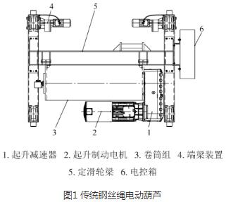 該設(shè)備與傳統(tǒng)鋼絲繩電動葫蘆相比較,其主要構(gòu)成部件較為相似,由起升制動電機、起升減速器、卷筒組、定滑輪梁、端梁裝置和電控箱等組成。