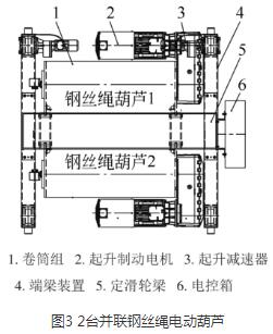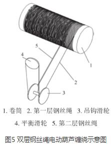 采用4/2倍率繞繩方式,由于第一層鋼絲繩與第二層鋼絲繩在卷筒上有高低差(即鋼絲繩直徑差),卷筒轉(zhuǎn)動時,上下兩層鋼絲繩進出繩速度會不一致,因此,通過增加一個平衡滑輪,調(diào)整繩速,使起吊平穩(wěn),解決了以往2臺電動葫蘆并聯(lián)時容易出現(xiàn)的出繩和入繩不同步的現(xiàn)象,提高了鋼絲繩電動葫蘆的使用壽命。