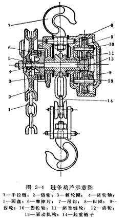 圖3-4為齒輪式手拉鏈條葫蘆。當(dāng)提升重物時(shí),手拉鏈1使鏈輪2按順時(shí)針?lè)较蜣D(zhuǎn)動(dòng)。鏈輪2沿著圓盤(pán)5套筒上的螺紋向里一動(dòng),而將棘輪圈3和摩擦片6都?jí)壕o在鏈輪軸4上(鏈輪軸4與圓盤(pán)5牢固形成一體),棘輪圈3只能順時(shí)針?lè)较蜣D(zhuǎn)動(dòng),棘爪在棘輪圈3上跳動(dòng)發(fā)出嗒嗒之聲。鏈輪軸4右端的齒輪12帶動(dòng)齒輪9(或稱行星齒輪)與固定齒圈8相嚙合,使齒輪9沿鏈輪軸4為中心順時(shí)針?lè)较蛞苿?dòng)。同時(shí)帶動(dòng)驅(qū)動(dòng)機(jī)構(gòu)13和起重鏈輪11轉(zhuǎn)動(dòng),使起重鏈子14上升。當(dāng)不拉手拉鏈之后,重物是靠自重產(chǎn)生的自鎖現(xiàn)象和棘爪組織棘輪圈3逆時(shí)針?lè)较蜣D(zhuǎn)動(dòng)而停止在空中。反之,當(dāng)松下重物時(shí),手拉鏈1使鏈輪2和圓盤(pán)5分離。則鏈輪軸4右端的齒輪12帶動(dòng)齒輪9與固定齒圈8相嚙合,使齒輪9沿鏈輪軸4為中心逆時(shí)針?lè)较蜣D(zhuǎn)動(dòng),同時(shí)帶動(dòng)驅(qū)動(dòng)機(jī)構(gòu)13和起重鏈輪11轉(zhuǎn)動(dòng),使起重鏈子14下降。當(dāng)不拉手拉鏈之后,因鏈輪2停止轉(zhuǎn)動(dòng)時(shí),起重鏈輪11受重物自重還要繼續(xù)沿逆時(shí)針?lè)较蜣D(zhuǎn)動(dòng),行星齒輪傳動(dòng)機(jī)構(gòu)同樣沿逆時(shí)針?lè)较蚶^續(xù)轉(zhuǎn)動(dòng),使圓盤(pán)5、摩擦片6及棘輪圈3相互之間相互壓緊而產(chǎn)生摩擦力,棘輪圈3受棘爪阻止不能向逆時(shí)針?lè)较蜣D(zhuǎn)動(dòng),于是摩擦力作用在螺紋上產(chǎn)生自鎖,使重物停止在空中。