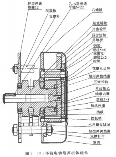 葫蘆機體的組件圖樣如圖3所示,其中齒輪傳動采用2組對稱排列的二級直齒圓柱齒輪傳動。I級和II級齒輪傳動具有相同的實際中心距。