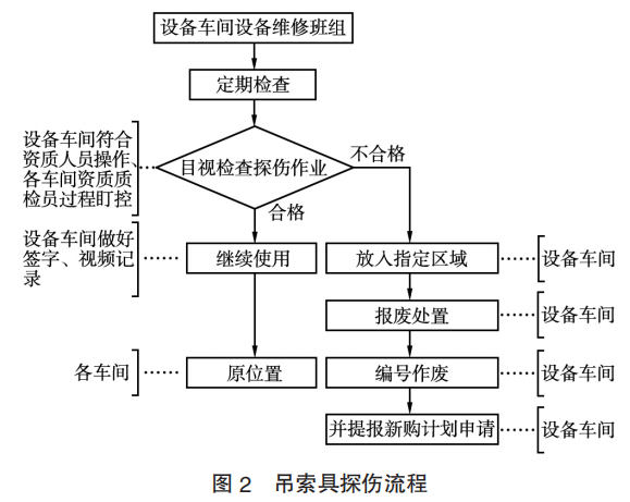 由設(shè)備車(chē)間定期進(jìn)行檢查檢測(cè),經(jīng)過(guò)探傷后合格的吊索具交由原車(chē)間繼續(xù)使用,并做好相關(guān)視頻和紙質(zhì)記錄;對(duì)檢測(cè)不合格的,要放入指定區(qū)域,集中報(bào)廢處置并做好記錄,同時(shí)啟動(dòng)新購(gòu)流程。
