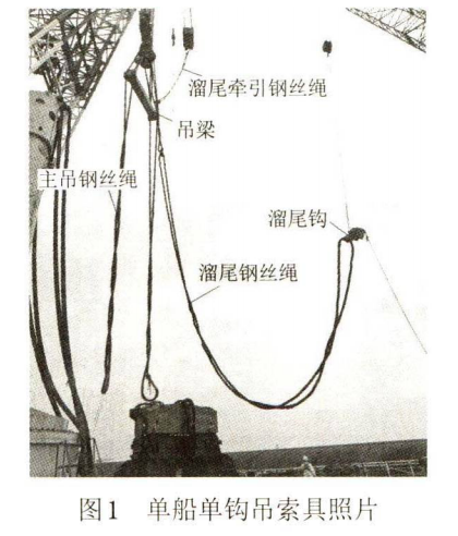 根據(jù)樁長、樁重、水深、吊耳高度及吊距,選用單鉤起重船。吊索具配置有溜尾狗鉤、溜尾鋼絲繩、溜尾牽引鋼絲繩、吊梁及主吊鋼絲繩等。先采用卡環(huán)將溜尾鉤與溜尾鋼絲繩連接;然后將吊梁、主吊鋼絲繩、溜尾鋼絲繩掛在主鉤上,采用牽引鋼絲繩將溜尾鋼絲繩上端與副鉤相連,見圖1。