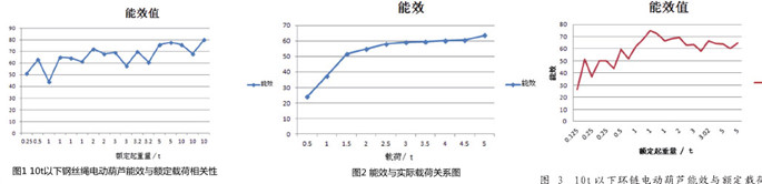 在對不同規(guī)格,不同型號的環(huán)鏈電動葫蘆的能效值進行對比的同時,還收集了同1臺葫蘆在從輕載到額載工況下,能效隨試驗載荷變化而變化的試驗數(shù)據(jù)。經(jīng)過對數(shù)據(jù)的分析,圖2列舉了一臺5t的雙速環(huán)鏈電動葫蘆能效隨載荷變化的變化曲線,此曲線具有廣泛代表性。根據(jù)曲線趨勢,可得出以下結論,鋼絲繩電動葫蘆在吊載不足30%額定起重量的載荷時,其能效值很低,大量能量均被浪費,當?shù)踺d重物超過30%額定起重量的載荷時,電動葫蘆的能效值會有顯著提升,并逐漸趨于高能效值,直至吊載重物超過50%額定起重量,能效值變化非常微小,趨于穩(wěn)定。