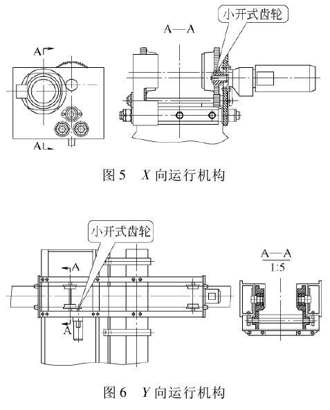 X、Y運行機構采用H型鋼運行軌道,為解決輪壓分布不均勻,易打滑的現(xiàn)象,車輪采用小開式齒輪—+同步開式齒輪裝置傳動的形式,運行機構采用三合一減速電動機,結構簡單,運行平穩(wěn),安全可靠。X、Y運行機構見圖5和圖6。
