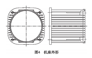 機座外形如圖4所示。取消上部葉片以滿足定子外徑的需要,下部葉片也相應取消,一方面是為了對稱設計,減少機座變形,同時也是美觀的需要;另一方面,下部機座外形平整,便于電機運輸、裝配和維護等。兩側葉片采用水平方向葉片,外形協(xié)調美觀。機座采用鋁合金壓鑄件,壓鑄件尺寸精度較高,一般為IT5-IT7,可以減少毛坯的加工余量,減少切削工作量;鋁合金材料利用率高,既節(jié)約材料又節(jié)省加工工時;壓鑄件表面粗糙度小,一般可達到3.2-0.8,有良好的外觀質量;壓鑄件抗拉強度高;壓鑄件質量穩(wěn)定,可滿足大批量生產。