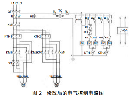 (1)急停開關(guān)不能切斷總電源。解決對(duì)策:更改原電動(dòng)葫蘆的控制電路,增加一個(gè)能斷開總電源的接觸器。急停開關(guān)是帶自鎖的按鈕開關(guān),不能自動(dòng)復(fù)位。實(shí)施方案:原控制箱的電器元件已老化,箱體內(nèi)無法增設(shè)接觸器。因此,從長(zhǎng)遠(yuǎn)考慮,為了保證質(zhì)量,更換電器控制箱是一個(gè)最佳方案。圖 2 為修改后的電氣控制電路圖,KM 是能斷開總電源的接觸器。對(duì)于不能更換控制箱的電動(dòng)葫蘆,必須增加控制電源接觸器。