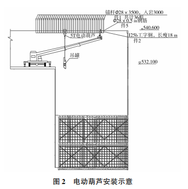 在抽水蓄能電站地下廠房土建及機(jī)電設(shè)備安裝施工過程中,因施工場地空間受限,導(dǎo)致材料垂直運(yùn)輸通道單一影響現(xiàn)場施工進(jìn)度。為解決此類問題,利用電動葫蘆具有體積小、自重輕、操作簡單、使用方便等特點(diǎn),采用在副廠房頂拱巖體位置安裝電動葫蘆、副廠房各樓層預(yù)留吊物孔的方式,形成副廠房臨時垂直運(yùn)輸通道,滿足土建施工期模板、腳手架。機(jī)電設(shè)備安裝期空壓機(jī)氣罐、電氣盤柜等材料設(shè)備的轉(zhuǎn)運(yùn),有效利用現(xiàn)場施工空間。從而達(dá)到提升施工效率、降低現(xiàn)場施工強(qiáng)度及節(jié)約施工成本的目的。