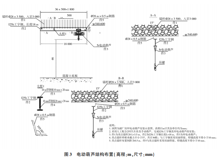 吊點(diǎn)錨桿施工:在通風(fēng)機(jī)房樁號CZO-122.00右6m至主廠房副廠房廠左12m段洞頂供高程540.600m位置布設(shè)一根125b工字鋼長度18m 。5t電動葫蘆通過125b