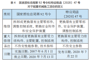 關(guān)于更換電動葫蘆的施工定性,主要由《起重機(jī)械安全監(jiān)察規(guī)定》(國家質(zhì)檢總局第 92 號令)和之后發(fā)布實(shí)施的《市場監(jiān)管總局特設(shè)局關(guān)于明確起重機(jī)械有關(guān)名詞術(shù)語含義的通知》(特設(shè)局函〔2020〕47 號)這兩個文件予以規(guī)定,具體定義詳見表 4,其中國家質(zhì)檢總局第 92 號令已廢止。根據(jù)上述文件的定義說明,對于更換同規(guī)格電動葫蘆的行為,根據(jù)國家質(zhì)檢總局第 92 號令屬于重大修理,根據(jù)特設(shè)局函〔2020〕47 號屬于一般修理。
