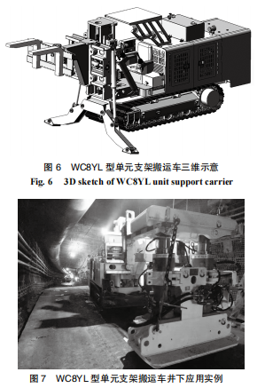 為提高單元支架的搬運效率,聯(lián)合專業(yè)廠家研發(fā)了 WC8YL 型單元支架專用搬運車,并已在神東集團錦界煤礦、新汶集團內(nèi)蒙能源長城三礦、陜西麟北煤業(yè)園子溝煤礦等多家煤業(yè)公司成功應(yīng)用。WC8YL 型單元支架搬運車三維示意及井下應(yīng)用實例如圖 6、7 所示。