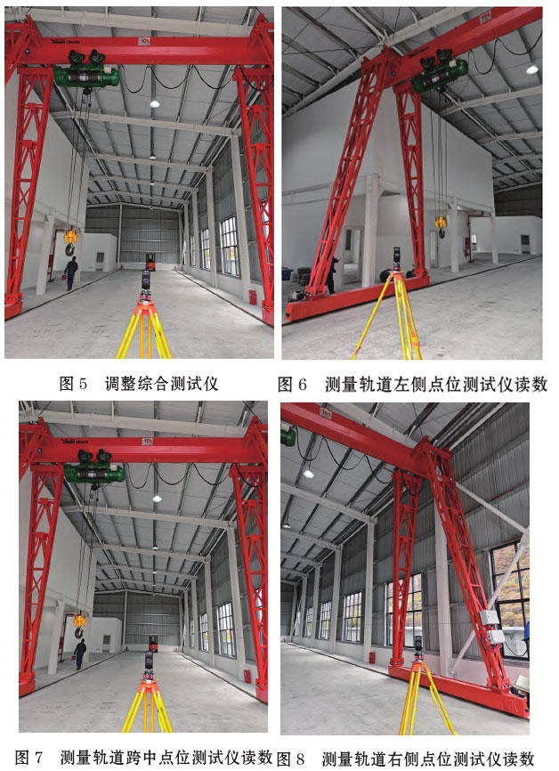 司,該設(shè)備于2023年5月19日校準(zhǔn),設(shè)備正常。面對主梁,放置綜合測試儀,調(diào)整水平(圖5)。將電動葫蘆運行至左側(cè)接近支腿處,露出軌道端部便于后續(xù)測量。