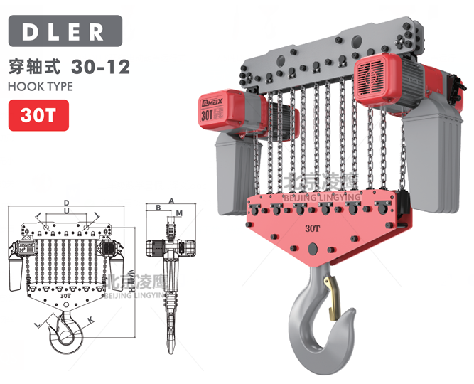 30噸DLER環(huán)鏈電動葫蘆穿軸式重物吊上吊下都有極限開關裝置,使電機自動停止,以防止鏈條超出,確保安全。