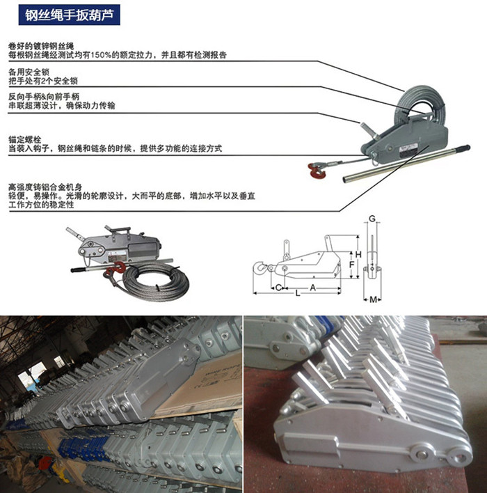 SM鋼絲繩手扳葫蘆機殼采用高強度優(yōu)質(zhì)鋁合金壓鑄而成,配套使用的鋼絲繩具有特別高的破斷拉力和耐磨性,根據(jù)客戶需要配置相適合的鋼絲繩長度。主要給個為800公斤、1600公斤、3200公斤。適用于工廠、礦山、建筑工地、碼頭、運輸?shù)雀鞣N場合,是設備安裝、貨物起吊、物體固定、綁扎和牽引的理想工具,尤其是任意角度的牽引和在場地狹小,露天作業(yè)和無電源的情況下,更顯示其優(yōu)越性。本產(chǎn)品嚴格按國家3包執(zhí)行,產(chǎn)品質(zhì)量由中國人民保險公司(PICC)承保,請放心使用。